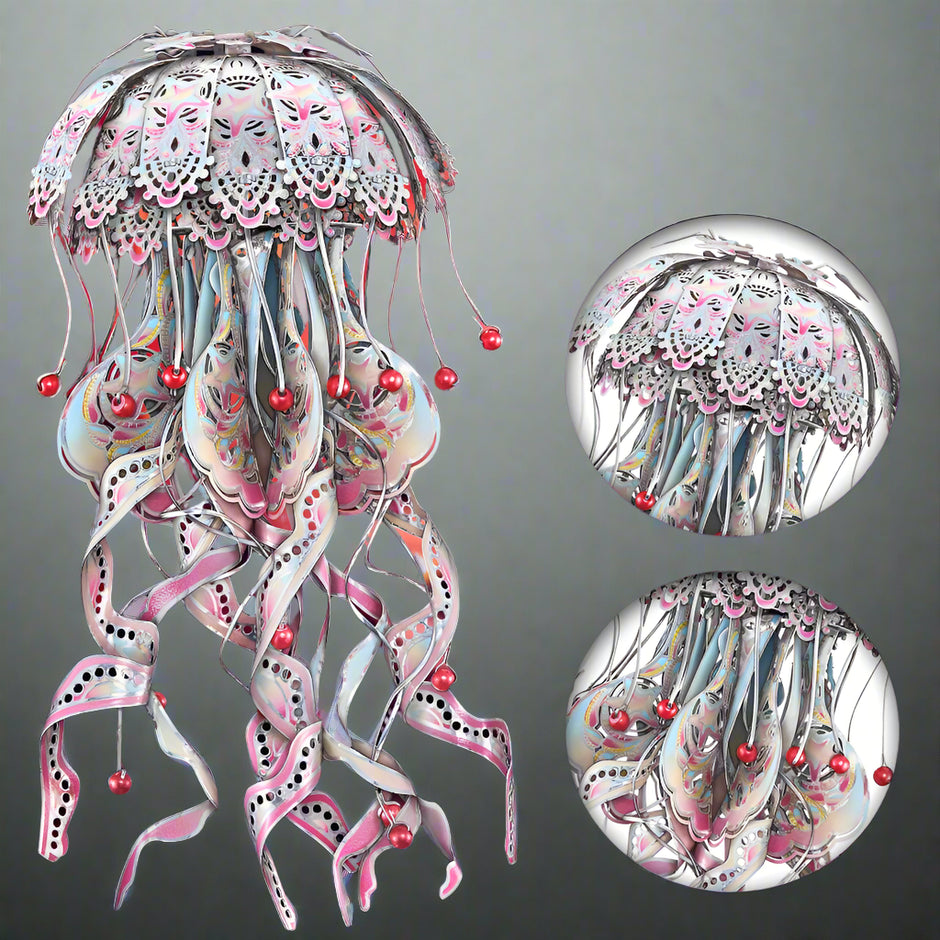 Multiple angles of completed 3D metal jellyfish puzzle highlighting design features 3D metal jellyfish puzzle packaging and contents overview Side view of completed 3D metal jellyfish puzzle showing dimensional depth 3D metal jellyfish puzzle construction details and connection methods Artistic presentation of completed 3D metal jellyfish puzzle in display setting 3D metal jellyfish puzzle piece separation and preparation process Detailed view of 3D metal jellyfish puzzle tentacle construction elements Premium 3D metal jellyfish puzzle gift presentation and quality showcase Final assembled 3D metal jellyfish puzzle demonstrating professional craftsmanship quality